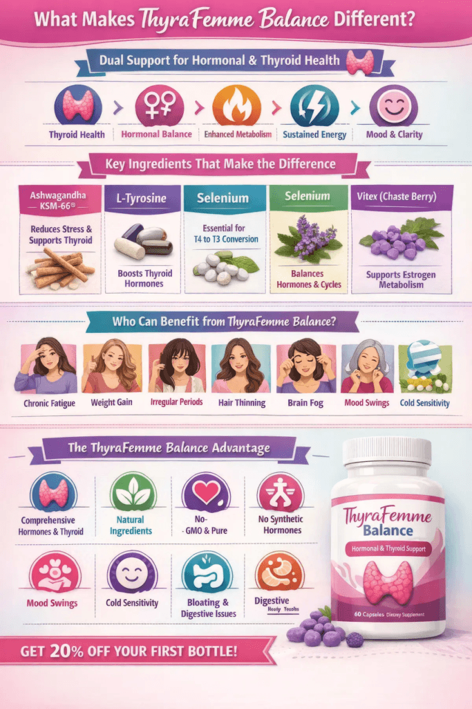 Don’t let hormonal imbalances and thyroid dysfunction control your life any longer. ThyraFemme Balance offers the comprehensive, natural support your body needs to thrive. With its unique dual-action formula, you can address the root causes of your symptoms and reclaim your vitality.